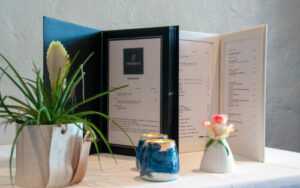 Menu €88 aperitief, wijnen, water en mokka inbegrepen.